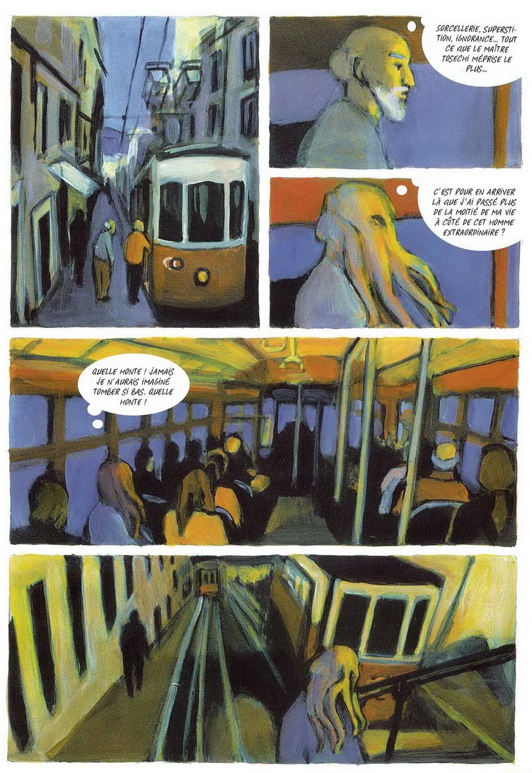 E' della giovane disegnatrice francese Aude Samama (su testi dell'argentino Jorge Zentner) quest'altra novel intitolata Lisbonne Dernier Tour, che racconta la storia di un pregisti... prestigi...prestidigi... Oooh al diavolo, di un illusionista chiamato Tosechi, che dopo aver raggiunto l'apice della fama si ritrova a vivere un periodo di decadenza. Aldilà della trama, che ci ricorda tanto qualcosa, non possiamo che restare innamorati delle bellissime tavole della Semama, realizzate con uno stile pittorico prossimo alla pittura espressionista.